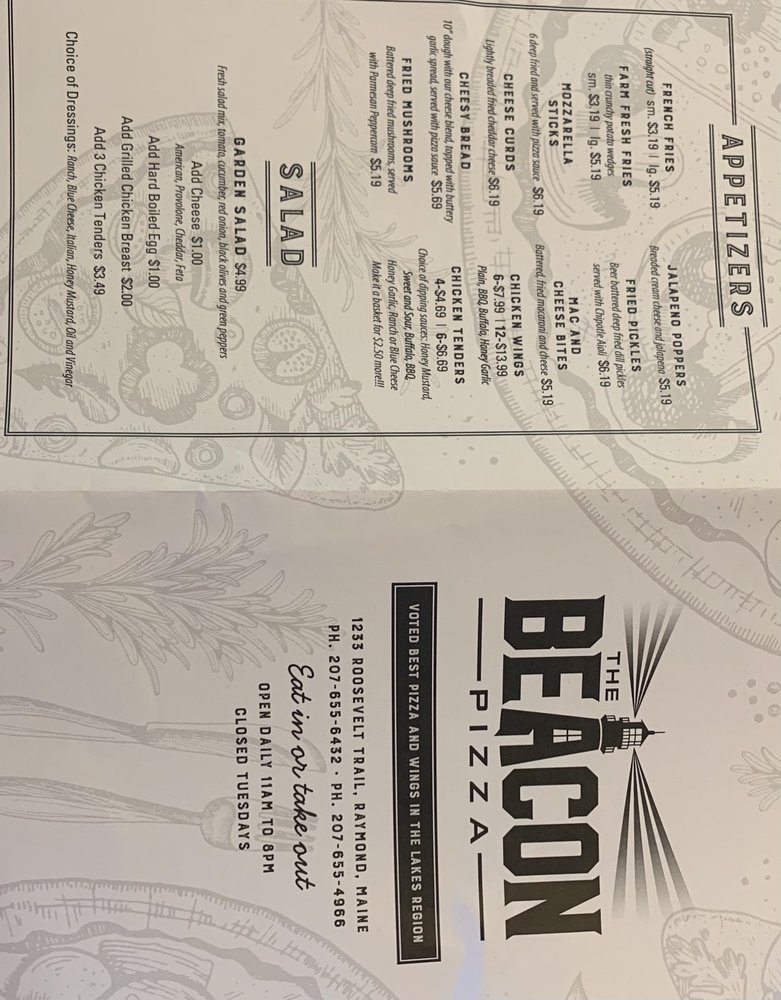 Welcome to The Beacon Pizza, a delightful culinary gem located at 1233 Roosevelt Trail in Raymond, ME. This unclaimed eatery specializes in pizza and sandwiches, perfect for group gatherings or a casual meal with friends.